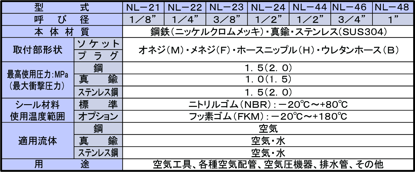 ●ソケットに内蔵されたバルブがプラグの着脱に応じて自動開閉します。 ●ソケット・プラグの接続部多様化により自由な組合せができます。(NL-21〜NL-24のソケットとプラグ、または、NL-44〜NL-48のソケットと プラグで連結してください。) ●本体材質は、鋼・真鍮・ステンレス鋼があります。鋼部品の主要部に 焼入れを施す事で、高耐久性・高耐摩耗性を実現しています。 ●広範囲な用途・環境に対応できるように、豊富な種類を用意しています。  |